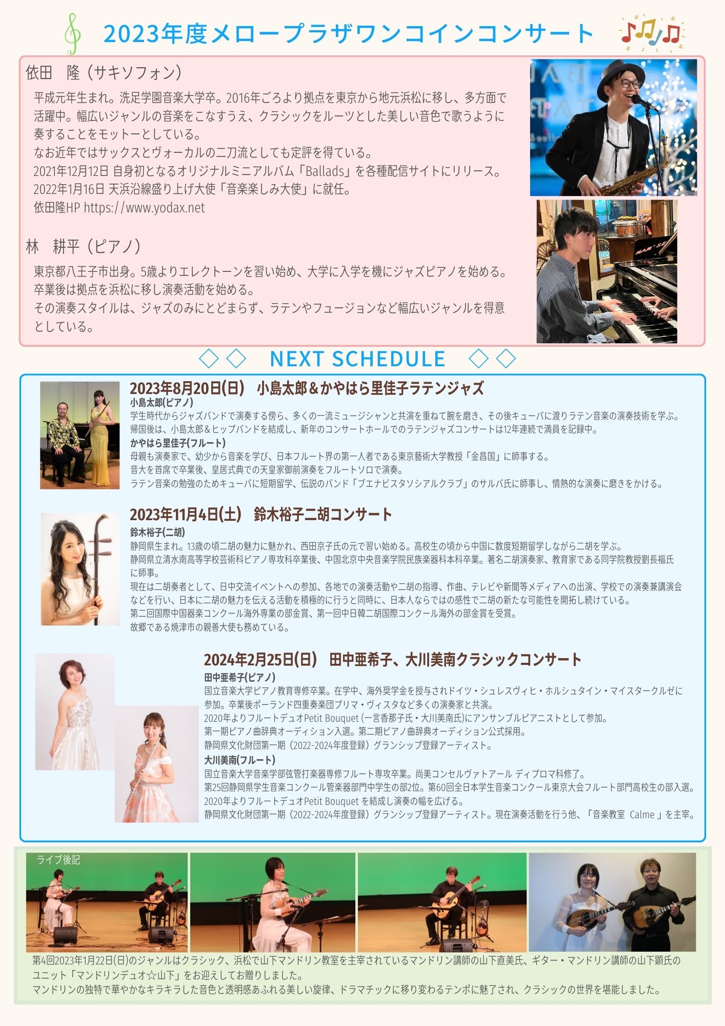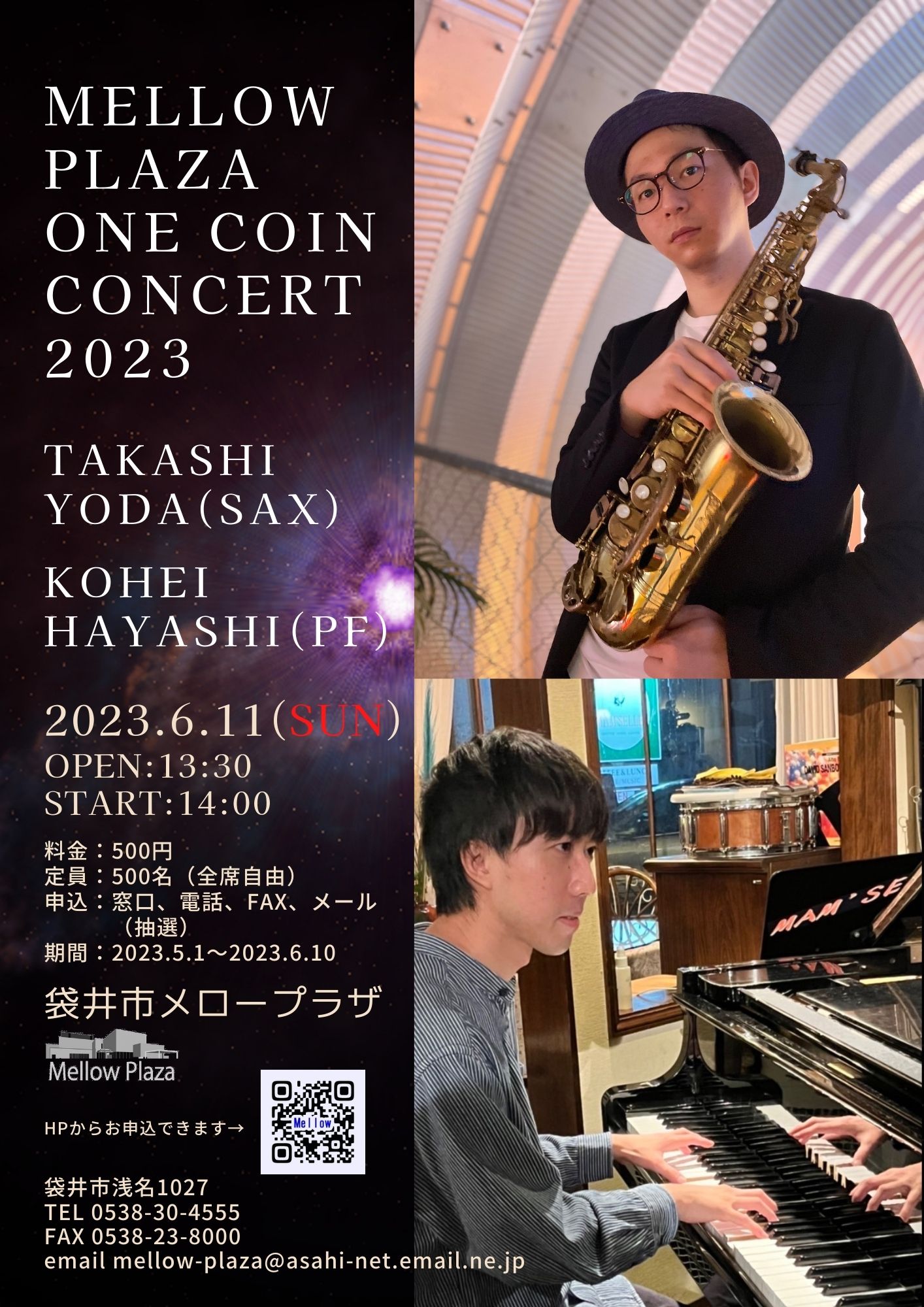 ![]() 依田 隆さん奏するサキソフォンと、林 耕平さんのピアノとの息の合った演奏をお楽しみください。 日 程:令和5年6月11日(日) 14時開演 会 場:袋井市メロープラザ多機能ホール 袋井市浅名1027 お問合せ:0538-30-4555 詳細は、ホームページでご確認下さい。 今後のスケジュールも合わせてお知らせいたします。 ![]() 皆様のお越しを心よりお待ちしています。