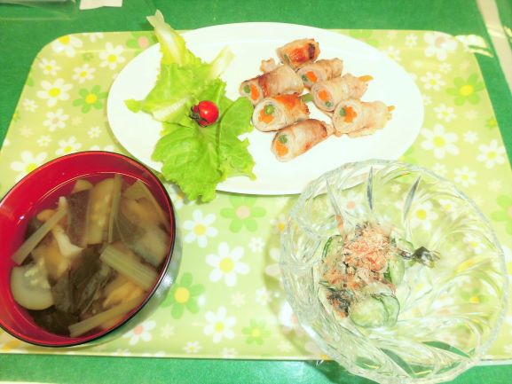 〇お野菜まきまき♪豚肉ロール 〇きゅうりとわかめの梅肉あえ 〇なすとズッキーニのみそ汁 どれも野菜たっぷりです。 塩分控えめなのに「美味しい」その秘密は… 「彩り」「シャキシャキ食感」「シッカリとっただし」 …でしょうか? 『私たちの健康は私たちの手で』 をスローガンに、健康食の普及活動をする ボランティア団体「食推さん」 のホントの名前は 「健康づくり食生活推進協議会」です。