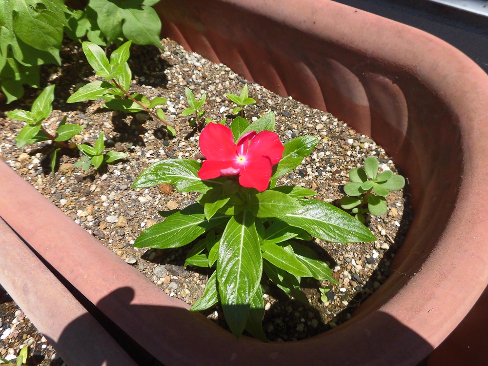 一週間前のブログに朝顔が咲いた報告をしたのですが、今度は同じプランターに日々草が咲きました。この日々草は昨年の夏に咲いていた花の種が自然に育ったものです。