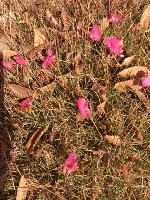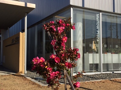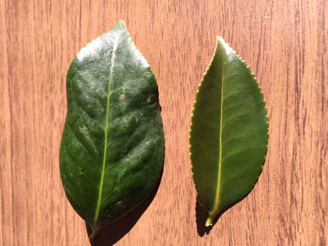 南玄関横の、山茶花(サザンカ) 北玄関前の(ツバキ) この両者は、山茶花が1月位まで、椿がそれを引き継ぐ様な開花期で、景観に彩りを演出します。メロープラザの敷地内には、山茶花(サザンカ)が8本、椿(ツバキ)が9本、植えられていますが、この両者は、よく似ていますが違いを見分けるポイントがいくつかあります。 その一つが、山茶花は花びらが一枚一枚ずつ散る。 これに対し、椿は、丸ごとポトリと落ちます。 また、葉っぱも、山茶花がギザギザして細長いのに対し、椿は、ギザギザしておらず、丸みがあります。 (左は椿、右は山茶花) メローにいらした折には、このポイントで、両者を見分けて頂ければと思います。