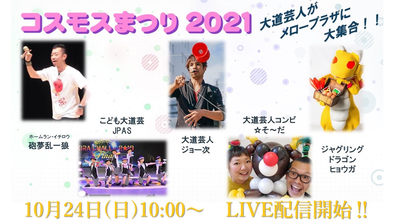 ![]() 2021年10月24日(日) 10:00~15:00 袋井市メロープラザにてコスモスまつりを開催いたします。 当日多機能ホールにて開催される大道芸大会の様子を『午前』と『午後』の2部に分けて生配信します。 驚きと笑いの大道芸を是非お楽しみください。 ◎午前の部 → 『コスモスまつり 大道芸大会 午前の部はここをクリック』 ◎午後の部 → 『コスモスまつり 大道芸大会 午後の部はここをクリック』 午前の部の出演 ・砲夢乱一狼(ホームラン・イチロウ) ・大道芸人 ジョー次 ・こども大道芸チーム JPAS ・大道芸人コンビ☆そ~だ 午後の部の出演 ・砲夢乱一狼(ホームラン・イチロウ) ・大道芸人 ジョー次 ・こども大道芸チーム JPAS ・ジャグリングドラゴン ヒョウガ |