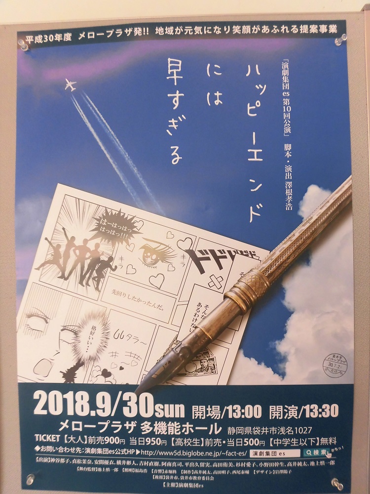 さて、そんな暗雲を吹き飛ばすかのような青空のポスターがメロープラザに届きました。 「演劇集団es(エス)」による演劇「ハッピーエンドには早すぎる」の告知ポスターです。これは「平成30年度 メロープラザ発!! 地域が元気になり笑顔があふれる提案事業」の一つです。 どんな内容の演劇なのか楽しみです。みなさんも是非、生の演劇に触れてみませんか? 日付:2018年9月30日(日) 開場:13時 開演:13時半 会場:メロープラザ多機能ホール チケット:[大人]前売 900円、当日 950円 [高校生]前売・当日 500円 [中学生以下]無料 お問合せ:演劇集団es公式HP ![]()
