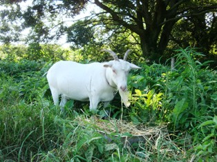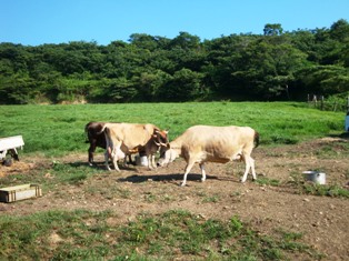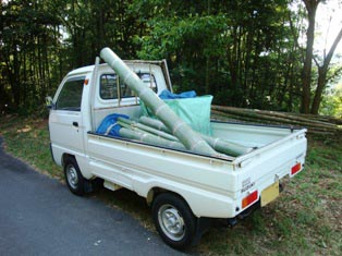 笠原地区の神谷さんと2人、軽トラックで急な斜面を登って行くと、頂上付近に直系20センチはあると思われる孟宗竹(もうそうだけ)が何十本もそびえ立つ大きな竹林がありました。 神谷さんと、のこぎりを使って3本の竹を採取し、適当な長さにしてトラックの荷台に積み込みました。 帰り際、牧場で飼育されている牛やヤギにも出会いました。とても暑い日でしたが、夏草をほおばり食欲旺盛でした。 ちなみに、この時期の竹は緑色をしていてきれいですが、加工するには水を吸収しなくなる秋口の竹の方が良いそうです。 デンマーク牧場の竹林です 軽トラック積み込みメロープラザへ 大きな牛です ヤギもいます
