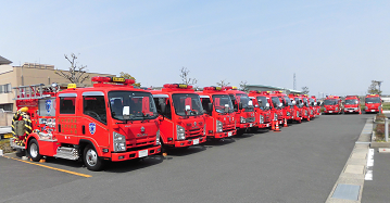 北側駐車場の桜が満開となり、そこにずらっと15台の消防車が並びました。多機能ホールでは、きびきびとした動きとラッパ隊の演奏の中で