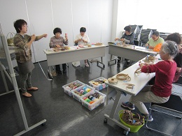 講師は趣味が高じてプロ級の腕前になられた豊田さんです。 初めての経験を前に不安が募る中、 豊田さんの「編み物よりも簡単ですよ」との一言に皆ホッと。 さくさくと紙テープを切り裂く快感と、 難しさに挑戦する真剣さと、 笑顔が入り混じった講座になりました。 きっと、 最終回の6月18日には、 素敵なオリジナルバックが出来上がることでしょう。