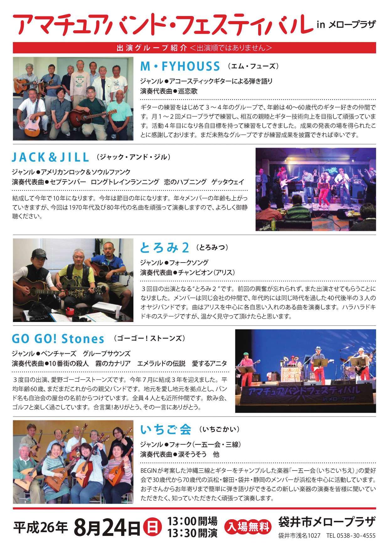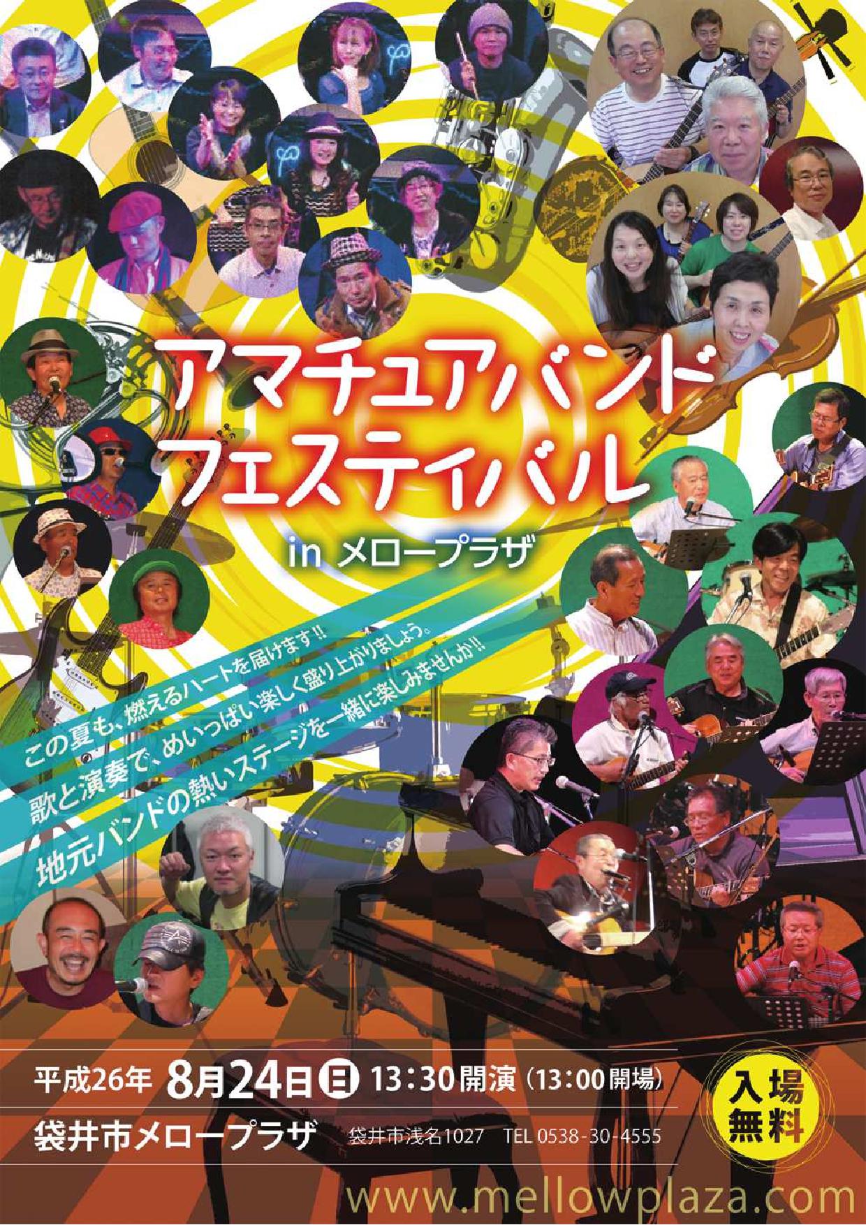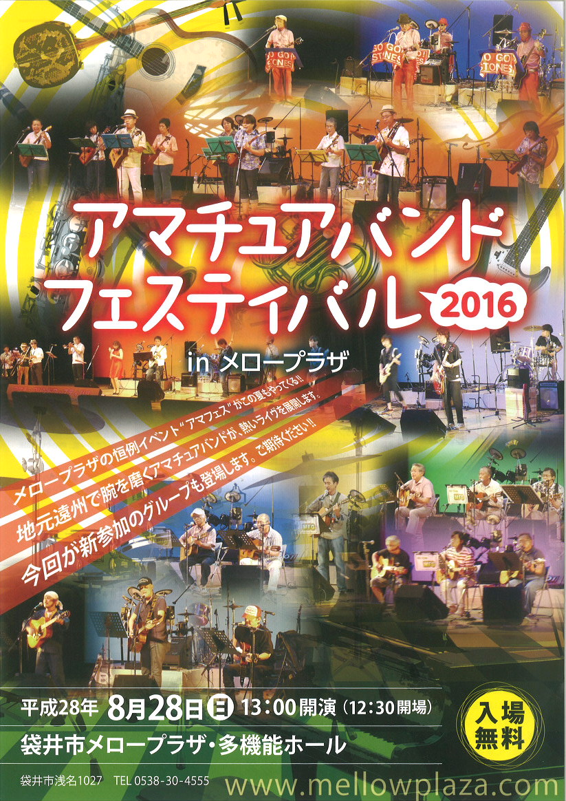 ![]() ![]() 今年も開催します!! 「アマチュアバンドフェスティバル in メロープラザ」 今年で3回目の開催となります。 毎回出演していただいているおなじみのグループや 今回が初の出演となるグループなど、 市内外で活動している5つのグループがメロープラザの多機能ホールで演奏します。 日時 8月24日(日) 開場13:00 開演13:30 場所 メロープラザ多機能ホール 入場無料 出演グループ(演奏順) 1. JACK&JILL 2. いちご会 3. とろみ2 4. M・FYHOUSS 5. GOGO!Stones 是非、ご来場ください。 5つのバンドが演奏する熱いステージを、一緒に楽しく盛り上がりましょう!!