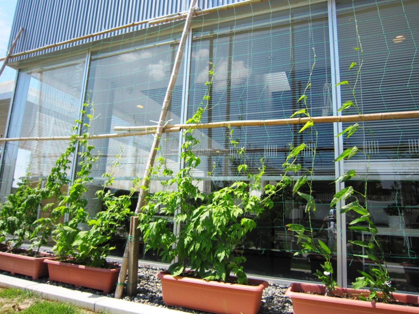 メロープラザ南側出入り口付近のグリーンカーテンは、 こんなに成長しました。 この写真ではわかりにくいですが、花も咲き始めました。 どんどん成長していく植物を見ていると、 元気をもらえますね。