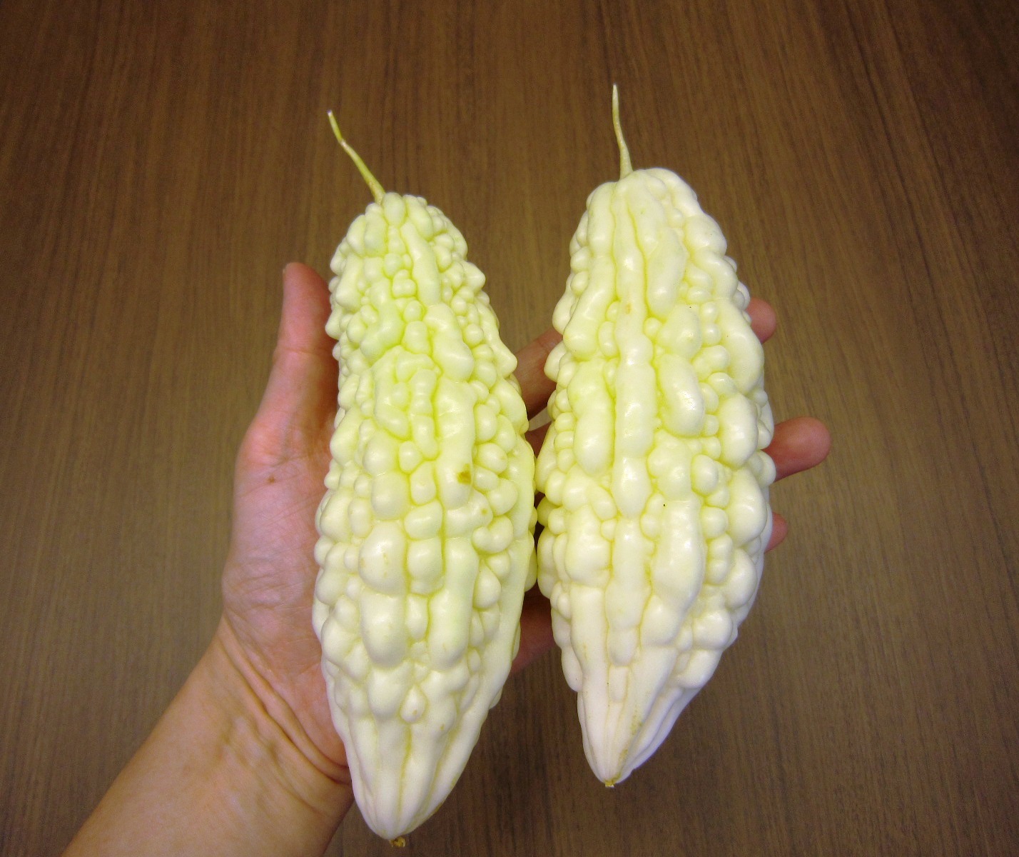 先程、グリーンカーテンの「白ゴーヤー」を2本収穫しました。