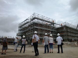 市政モニターとは、モニターとなった方から市政に対する様々なご意見やご提案を伺い、市民の声をまちづくりに反映することを目的としています。 この日は、公共施設や主要事業箇所などを巡り、午後4時頃到着されました。 まず、現場事務所内で施設概要をご説明した後、工事現場を視察いただきました。 この日は、現場監督から特別の許可を得て、一部施工が始まっている内部の様子もご覧いただきました。 先月後半から始まったコンクリートの打設工事ですが、数日で随分とコンクリートの部分が増え、建物の形が確認できるようになって来ました。 市政モニターの皆さんお見えいただきありがとうございました。 現場事務所内で施設概要を説明 ホール棟の説明を聞く市政モニターのみなさん 皆さんが歩いている場所はガレリア