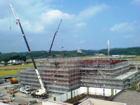 今月は、比較的好天に恵まれたため、8月末の工事進捗率は概ね40パーセントに達し、予定よりも若干先行できました。 明日からは9月と言うことで、平成21年9月市議会が開会となります。 このたびの議会には、これまで庁内プロジェクトを中心に検討してきた「メロープラザ管理運営計画(案)」を提出し、議員の皆さんのご意見を伺うこととしています。 市としての計画(案)が固まりましたら、市民の皆さんにご説明させていただきます。 より良いメロープラザとなるように、皆さんで意見のキャッチボールをしましょう。 よろしくお願いします。 ![]() クレーンが2台と奥の方にはコンクリートを運ぶ機械が見えます