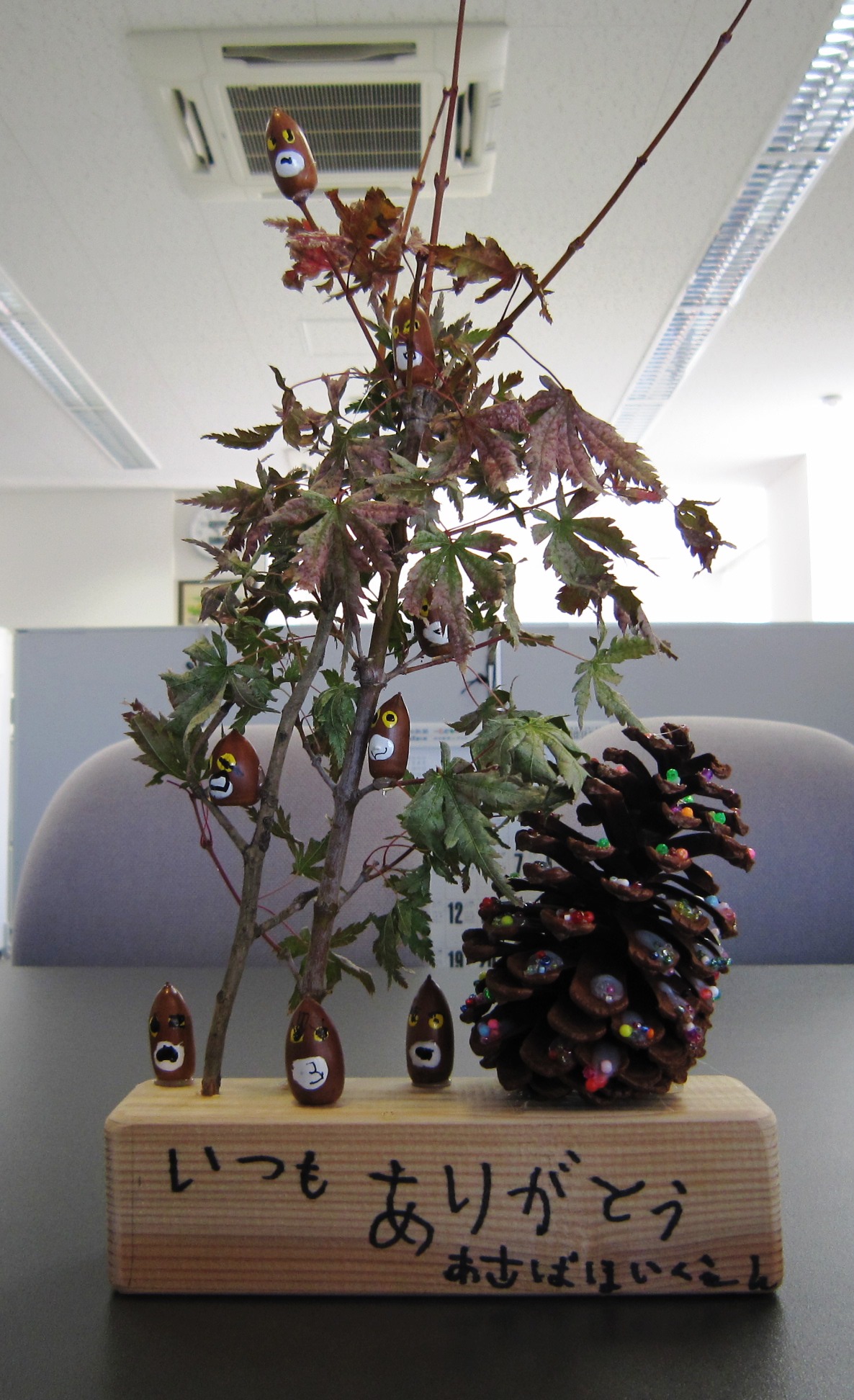 園児さん達が保育園や家にある、松ぼっくり、ドングリ、紅葉を拾い集めた完全手作り品。 職員一同大感激。 早速、受付カウンターに置かせていただきました。 利用者さんもあまりの可愛さに思わず二コリ。 ありがとうございました。 こらからもメロープラザに遊びに来てくださいね。 ![]()
