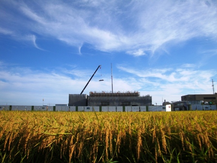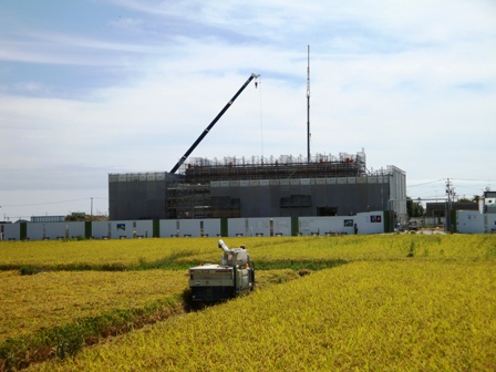 浅羽支所の屋上から見る景色も、ここ数日で緑から金色へと様変わりしました。 ホール棟や一般棟、和室棟など全ての建物の足場が最上部まで組まれました。 先週は、多いときで3台の大型クレーン車が配備され、フル稼働していました。 上部まで高く組まれた足場の上を、作業員の皆さんがせわしなく作業する姿が確認できます。 建物全体に足場が組まれました。 建物上部でも作業風景がみられるようになりました。 奥の方に見えるのは清掃センターです。 稲穂が金色に輝く田園は浅羽の代表的な風景だと思います。 最近は収穫時期が早く既に刈り取りが始まっています