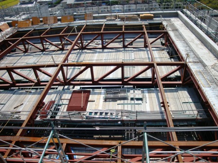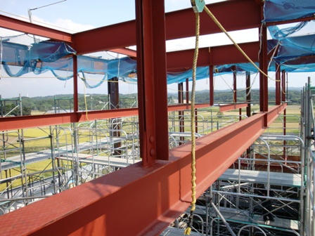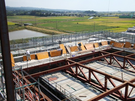 コンクリートの打設工事も、8割程度終わり、建具の取り付けのため打設したコンクリートを研磨して調整したり、機械設備用のダクトを取り付けたりしています。 本日は、シルバーウイーク特別企画として、建物上部や内部の作業風景をお伝えしたいと思います。 本日の現場風景です 建物上部でも多くの作業員の姿が見られます フライタワーから南方を望む フライタワーの鉄骨です コンクリートの打設はホール棟上部(この場所)を残しほぼ完了しました 高所の作業は危険が伴いますので、頑丈な足場が組まれており、細心の注意をはらって作業が進められています フライタワーを下から見た景色です 楽屋です 調子室や食工房です 和の空間へと向かう廊下です