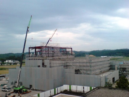 メロープラザの9月末現在の工事進捗状況は概ね50パーセントに達する見込です。 ホール棟では、フライタワーの工事が進められており、日を追うごとに足場の高さが増している状況が伺えます。 また、和室棟では、屋上防水工事が行われており、アスファルトが敷き詰められています。 ![]() フライタワーの鉄骨が組まれ、作業用の足場が設置されつつある ![]() 屋上防水のためのアスファルトが打たれている