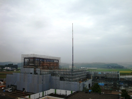 フライタワーの最上部にまで足場が組まれ、高所での作業が行われているため、雨、風には注意が必要です。 また、7日には、第6回メロープラザプロジェクト会議を開催し、管理運営計画の策定に関する庁内調整を行います。