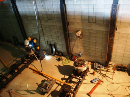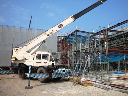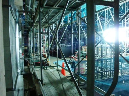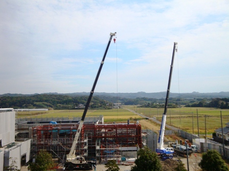 この着工により躯体工事も概ね終盤を迎えたこととなります。 ガレリアは、長さ50メートルにも及ぶアーケードのような機能で、これに沿って諸室が配置されています。 ガレリアの柱や梁となる鉄骨が複雑に組み合わされている様子が、写真から見て取れます。 また、ホール棟の内部では、可動席を収納する地下ピットなどの工事が行われています。 このように、近年にない大工事ですが、本日は総勢140人の方が作業にあたっています。 今後は、最高時で150人を越えるみなさんが工事にあたる見込です。 本日の工事現場の模様 大型クレーン車2台がガレリアの工事にあたる ホール棟と一般棟とをつなぐガレリア 地下に収納した可動席を持ち上げる床昇降機の取り付け ホール棟内部での作業の模様 空高くそびえるフライタワー