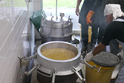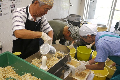 大豆を煮て、発酵させた米麹と合わせてミンチ、そして最後の樽詰め。