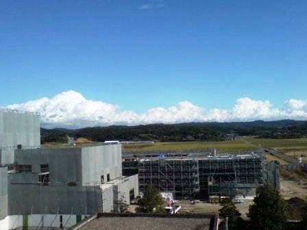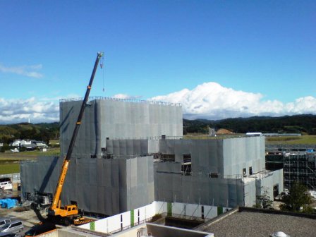 今週は、ホール等やガレリアの屋上防水工事を行うとともに、外壁のボードの取り付けや塗装作業を行います。 内装工事も進んで来ましたので、来週14日の土曜日には、管理運営計画などの説明会と工事現場見学会を行うことにしました。 ホームページでご覧いただいている作業風景を、ご覧いただく絶好の機会です。 ホール棟内部などは、かなり特徴的な工事内容ですし、延長50メートルに及ぶガレリアなどの距離感なども確認いただくことができますので、是非ご参加ください。 フライタワーのコンクリート型枠を取り外したことが確認できる(10月28日撮影) ![]() 再び防護ネットのベールに包まれたフライタワー(11月2日撮影) ![]() ガレレアの屋根工事や外壁の取り付けが行われている