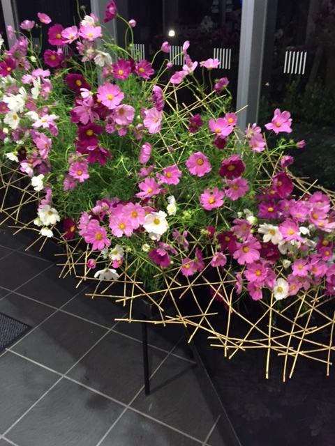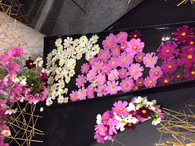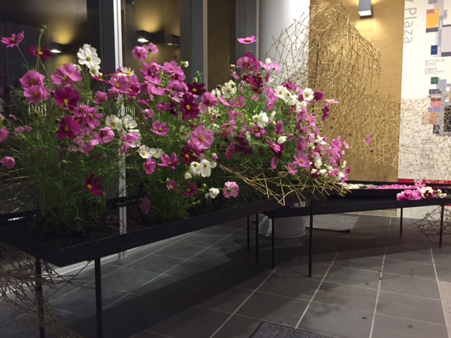 北玄関では。草月流のお花の先生による「コスモスの出迎え」が出来上がりました。 ホールでは、プレゼンのリハに余念がありません。 展示も出来上がりつつあります。 「花、健康、食、あそび」で皆様をお待ちしています。