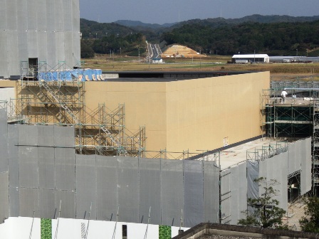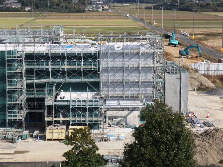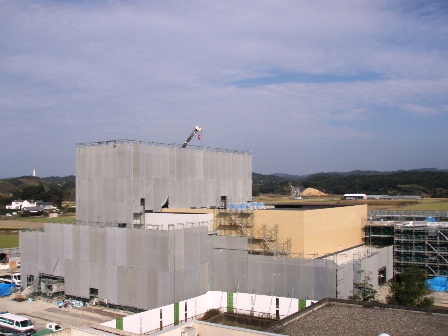 本日の工事現場は、一部防護ネットが取り外され、ホール棟壁面の塗装や屋上防水、ガレリアの外壁などが確認できます。 建物の塗装については、以前のブログでも紹介したとおり、自然色に近い黄土色(アースカラー)を採用することによって、周辺の景観に溶け込むよう工夫しています。 こうした現場の模様をご覧いただくことができるよう、14日(土)の午前10時から住民説明会と現場見学会を開催します。 この機会に、迫力ある作業の模様を、実際にご覧ください。 アースカラーに塗られた壁面が確認できる 屋根の黒く見える部分はアスファルト防水 ガレリアの壁面はアルミ亜鉛メッキ性の鋼板