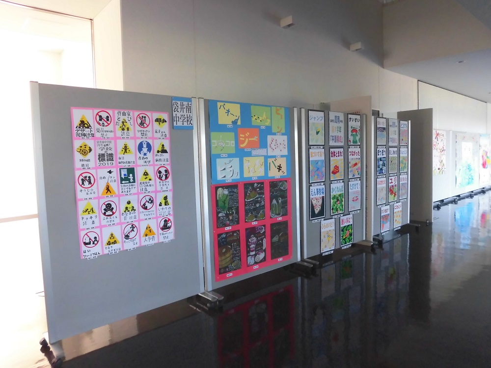 今回は市内の保育園、保育所、こども園、中学校の子どもたちによる絵画などの作品を展示しています。思い思いに描かれた子どもたちの作品を是非ご覧ください。