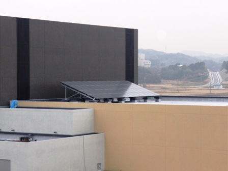 今回の現場リポートは、あいにく雨模様となってしまいましたが、写真からもお分かりのとおり、建物を囲んでいた足場は全て撤去され、屋上には太陽光 発電用のパネルが取り付けられています。