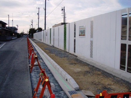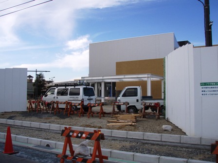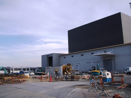 現場内にある洗車場が凍り付く寒さです。 厳しい寒さの中でも、工事は順調に進捗しており、北側と西側の囲いが既に撤去され、外構工事が進められています。 また、周辺では浅羽遊水池の工事も進められています。 今週のメロープラザ 北側ゲート付近の様子 南側道路に沿って歩道を整備 南側ゲート付近の様子 浅羽遊水池の工事も進む