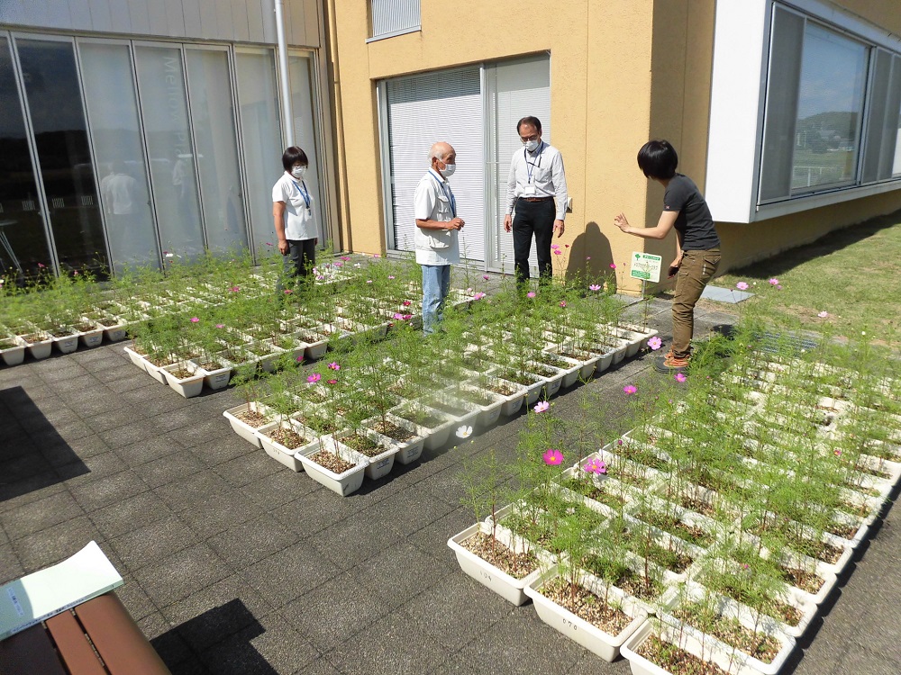 満開間近のコスモスや花壇の造成などの状況をご報告し、