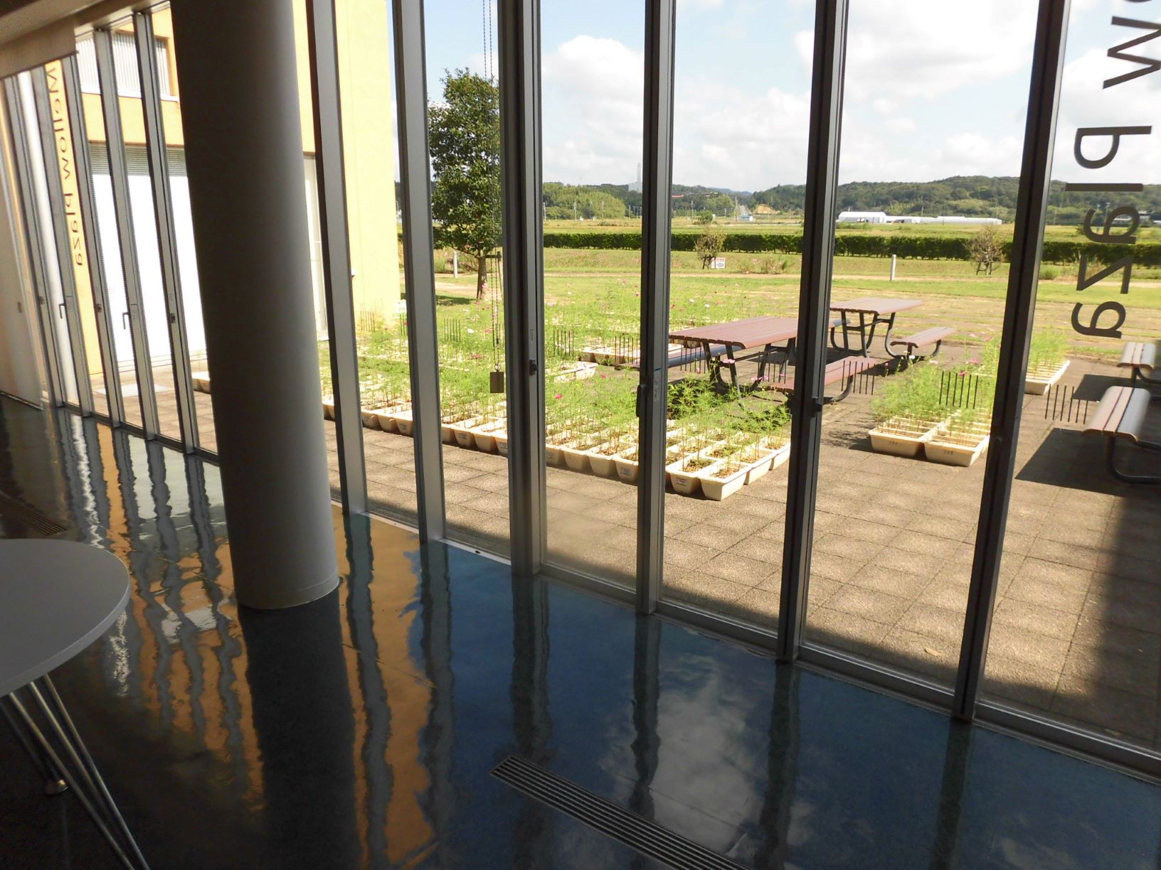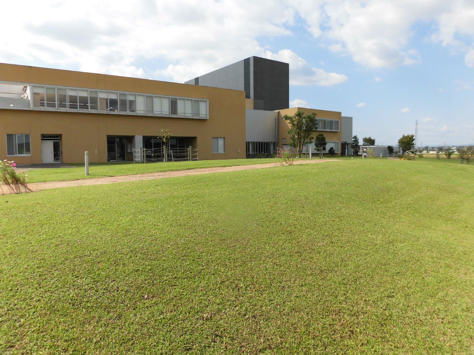 お褒めいただいたのが、私たちが自慢のメロープラザの建物に映える、青々とした芝生広場でした。