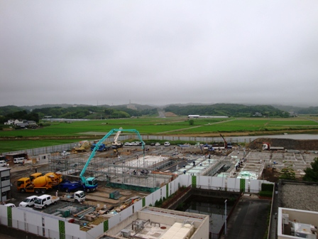 先週までの作業で、多機能ホール舞台部分の基礎にコンクリートが打たれました。 しだいに足場も上の方に向かって組まれはじめています。 25日には、外壁塗装の確認作業が行われる予定です。