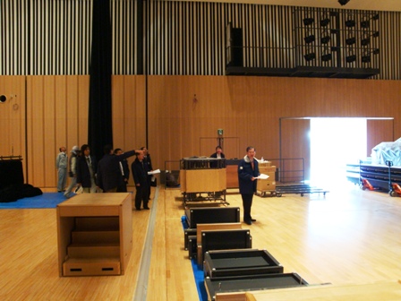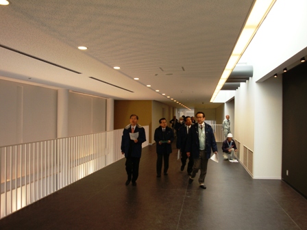 仕上がり具合も上々で、改めてこの施設の機能の素晴らしさを実感することができました。 市長から「素晴らしい出来映えで安心しました。しかし、開館に向けてここからが大切。市民の皆さんの視点に立って施設を点検し、安全対策には万全を期してください。」との指示がありました。 市民の皆さんに喜んで利用いただくためには、安全であることが何よりも重要です。複数の目で安全確認を行い、開館時には、より良い施設をご覧いただけるよう頑張ります。 2階ギャラリー付近の仕上がりを確認 ホールは客席の取り付けがほぼ完成した
