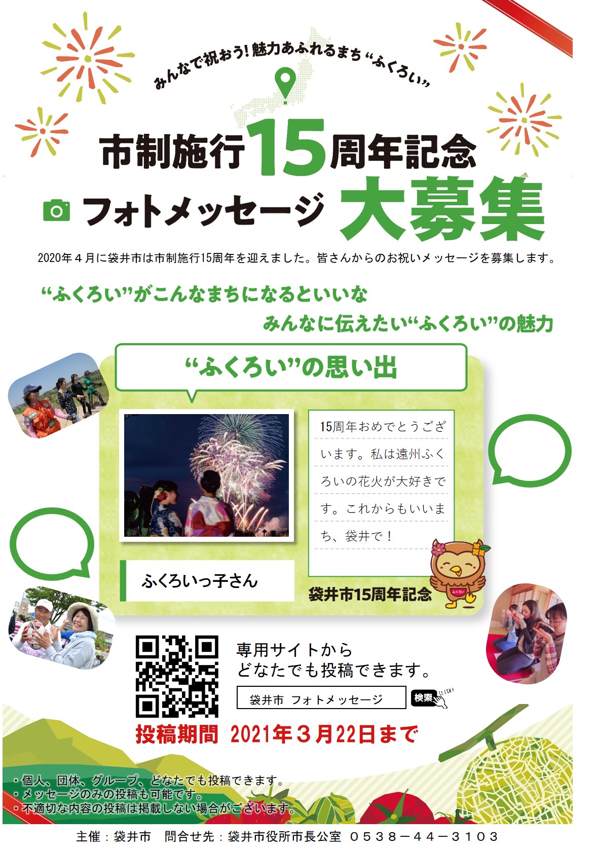 広く市民の皆様が参加できる生活様式を踏まえたイベントとして、 市制15周年記念『フォトメッセージ』を特設サイトにて募集しております。 ![]() ご興味のある方は是非ご応募ください。 |