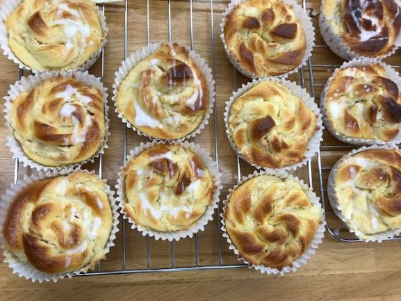 デニッシュロールは、アーモンドプードル、バターなどで作ったフィリングを挟んだ生地を細長く切り、ねじってお花のように焼き上げました。