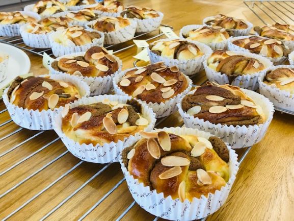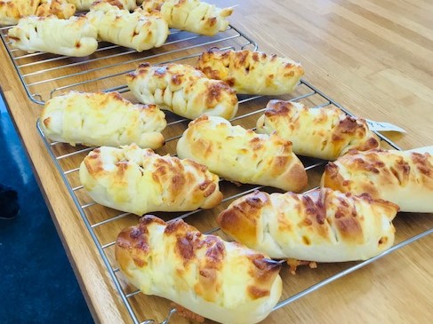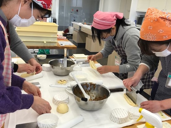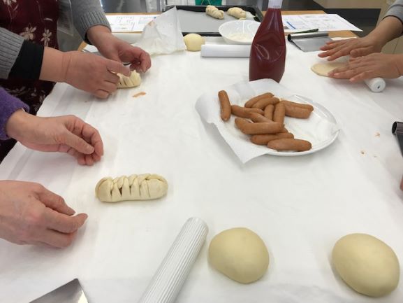 モカクリームは、コーヒークリームを挟んだ生地に切れ目を入れて、ねじって巻いたお花の形のパンです。 アーモンドスライスをトッピングして焼きました。 ウインナーロールは、だ円に伸ばした生地に、ケチャップとウインナーを包んだ、おしゃれなパンです。 分割・丸めの基本を復習しながら丁寧つくりました。 後期講座も来月が最後となります。 どうぞよろしくお願いします。 |