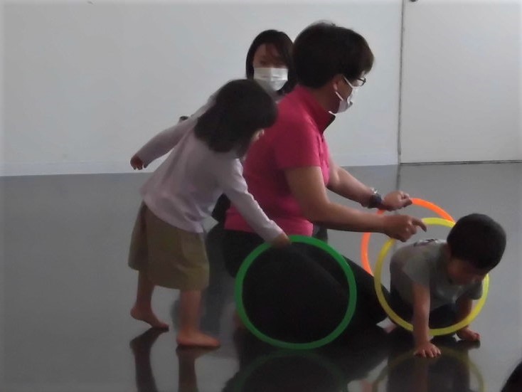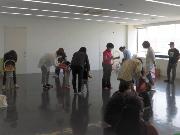 いろんな色のわっかをもって車の運転ブッブー。お父さん、お母さんはお客さん。