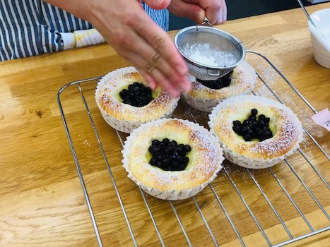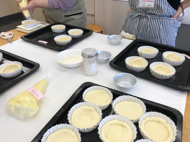 生地を手ごねして、丸く伸ばして型に入れ、真ん中にカスタードクリームをのせて焼きます。