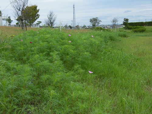 サポータークラブの皆さんの手で、今年初めて調整池の淵にコスモスの種がまかれました。