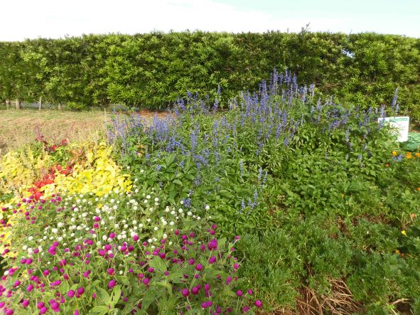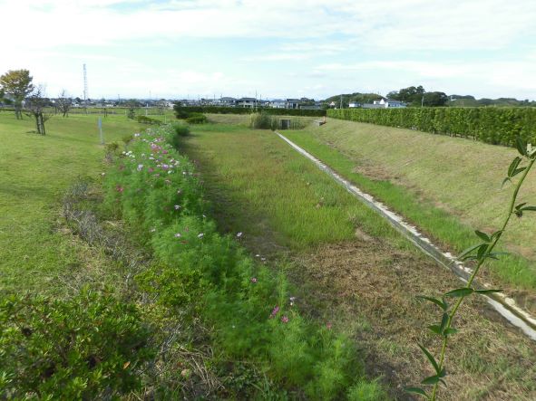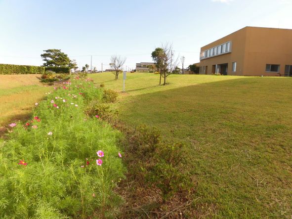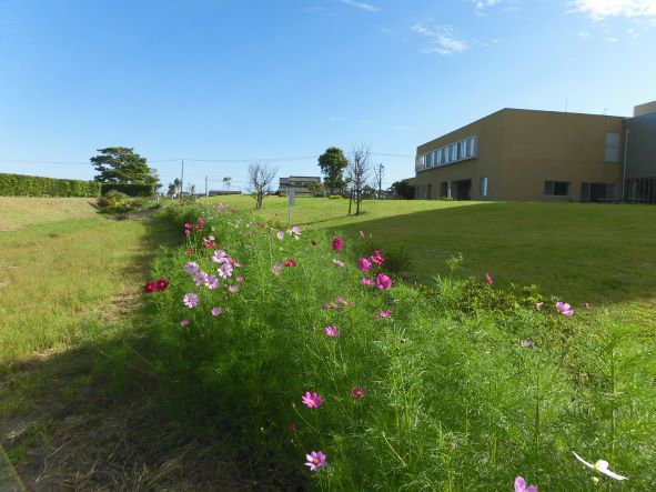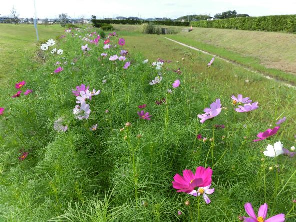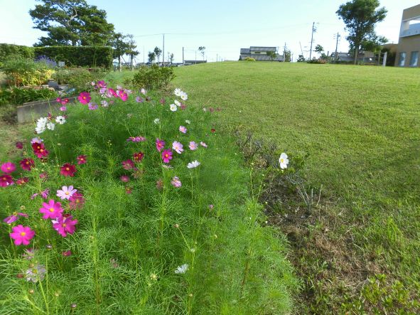 きれいな青空に秋の雲、メロープラザのコスモスも更に元気に育っています。