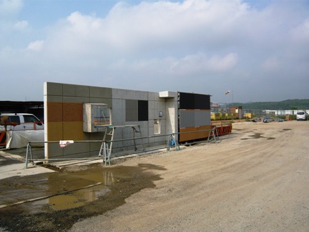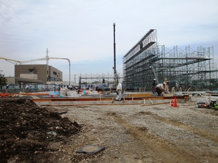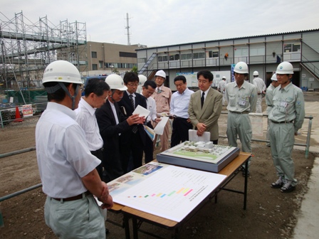 メロープラザでは、緑豊かな田園や里山の風景と調和した施設となるよう、外壁はアースカラー(自然色)を基調とすることなどを盛り込んだ景観計画を策定し、これを基本計画・基本設計に位置づけています。 本日は、市四役をはじめ、景観アドバイザーの藤江通昌先生や設計者、施工者など関係者が一同に介し、建設現場内に設けた外壁同様の塗装を施したコンクリート製色見本を前に、実際に着色したらどんなイメージになるかを最終確認しました。 設計者の鳥居さんと高木さんは、色見本以外にも模型や写真などを使って説明してくれましたので、ずいぶんと完成イメージが掴めたような気がしましたが、巨大なメロープラザの完成をイメージするのは、かなり難しい作業でした。 工事現場では、ホール棟のフライタワーの足場の組み立てがはじまりましたので、もう暫くすれば、施設規模がかなりイメージしやすくなると思います。 コンクリート製の色見本です 巨大なメロープラザをイメージするのは大変です フライタワーは21メートルの高さになります