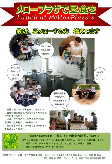 こう暑い日が続くと、ついつい冷たい飲み物に手が行ってしまいます。 こんなことでは、早々に夏バテしてしまいそうなので、今日は頑張って手製の弁当を持参しました。 中身は大したことないのですが、自分で作ったとなると食欲も湧いてくるから不思議です。 メロープラザのガレリアやホワイエは飲食可能なので、このところお弁当を持ってご来館になるお客様が増えています。 室温も、地球にやさしい28度に設定していますから快適です。 ランチタイムや休憩などでメロープラザをご活用いただき、元気に夏を乗り切りましょう! ホワイエのテーブルに置くとなかなか様になります 親子交流広場の帰りにお立ち寄りくださいました ガレリアのテーブルをつなげてランチタイムです 皆さんに気持ちよくお使いいただくための台ふきをご用意いたしました ![]() ただいま、昼メローキャンペーン中です