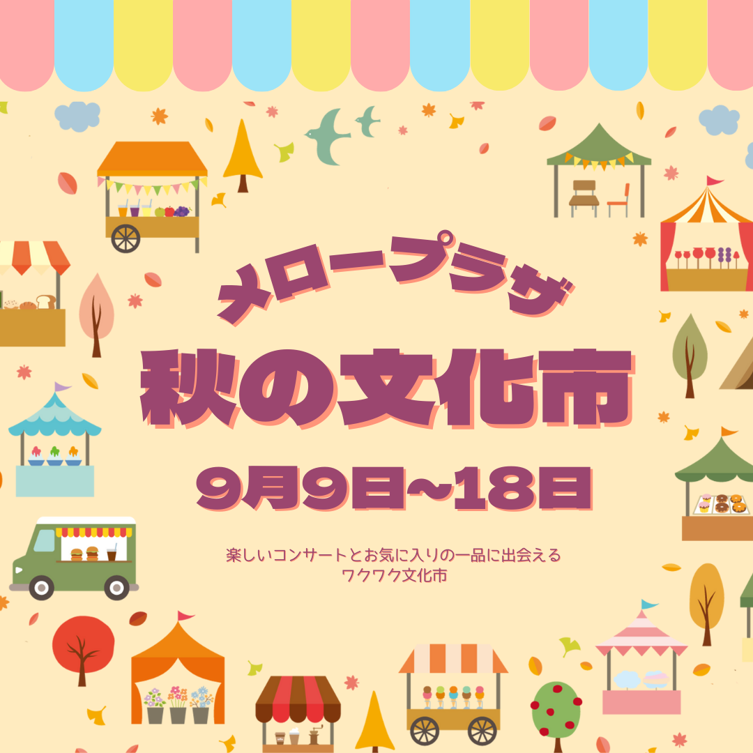 ![]() メロープラザ「秋の文化市」を今年も開催いたします。 9月9日~18日の期間、毎日ミニコンサートと手作り品のバザールを開催。 ミニコンサート40団体・手づくり品バザール21団体が出演、出店予定となります。 楽しいコンサートとお気に入りの一品に出会えるワクワク文化市。 当日のコンサートの様子をYouTubeにてLIVE配信を予定しております。 メロープラザのホームページからアクセスいただけますので是非ご覧ください。 (https://www.mellowplaza.com/) ![]() 9月10日,16日、17日は、田園かふぇ・オアシスのハンドドリップコーヒー出店があります。是非お立ち寄りください。 |