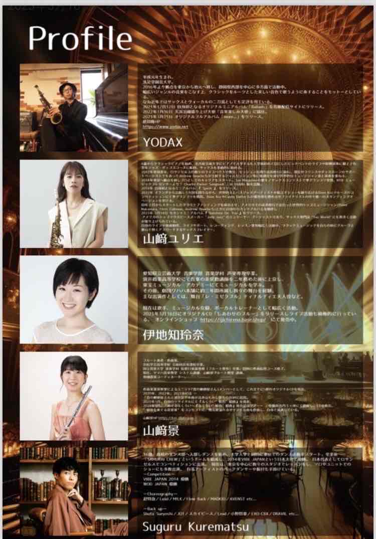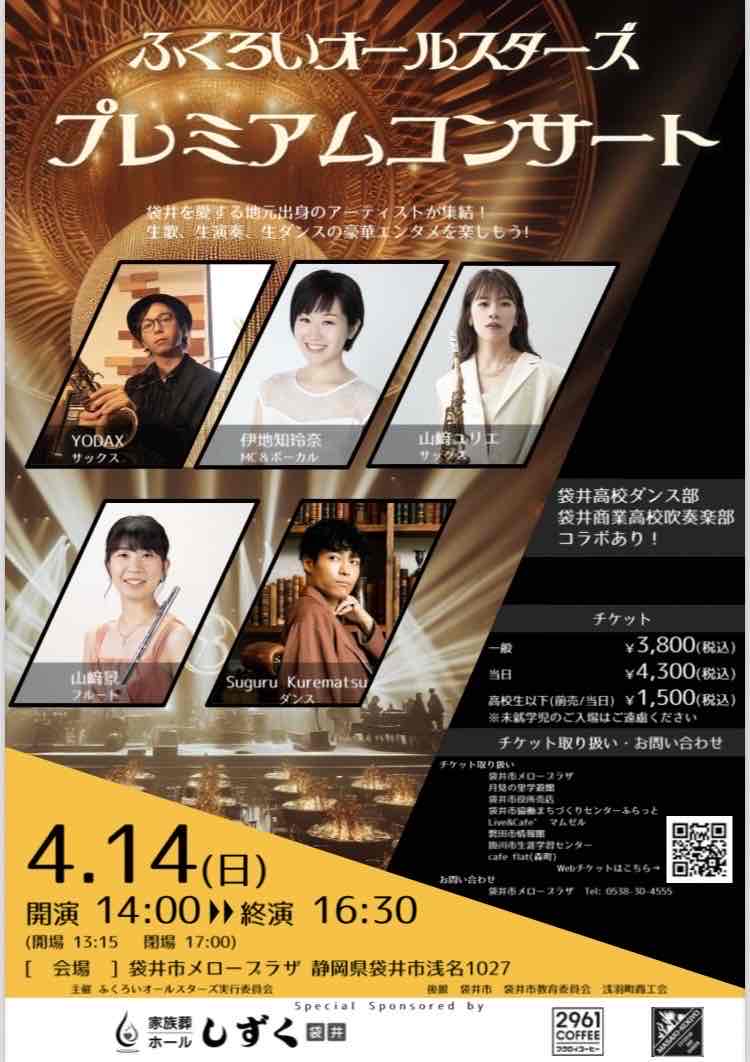 袋井市出身のミュージシャン、ダンサー5人が一堂に会し、スペシャルライブを開催。 静岡県西部地区で活躍するプロサックスプレイヤー依田隆の呼びかけに共感し4名のミュージシャン、ダンサーがメロープラザに集結。 ジャズ、クラシック、ポップスなど多彩な音楽とダンスを楽しめる2時間です。 さらに袋井高校ダンス部、袋井商業吹奏楽部との共演も実現。 チケット販売中!! 詳しくはメロープラザのイベントページをご覧ください。 ふくろいオールスターズプレミアムコンサート専用ページ |
